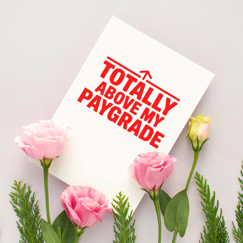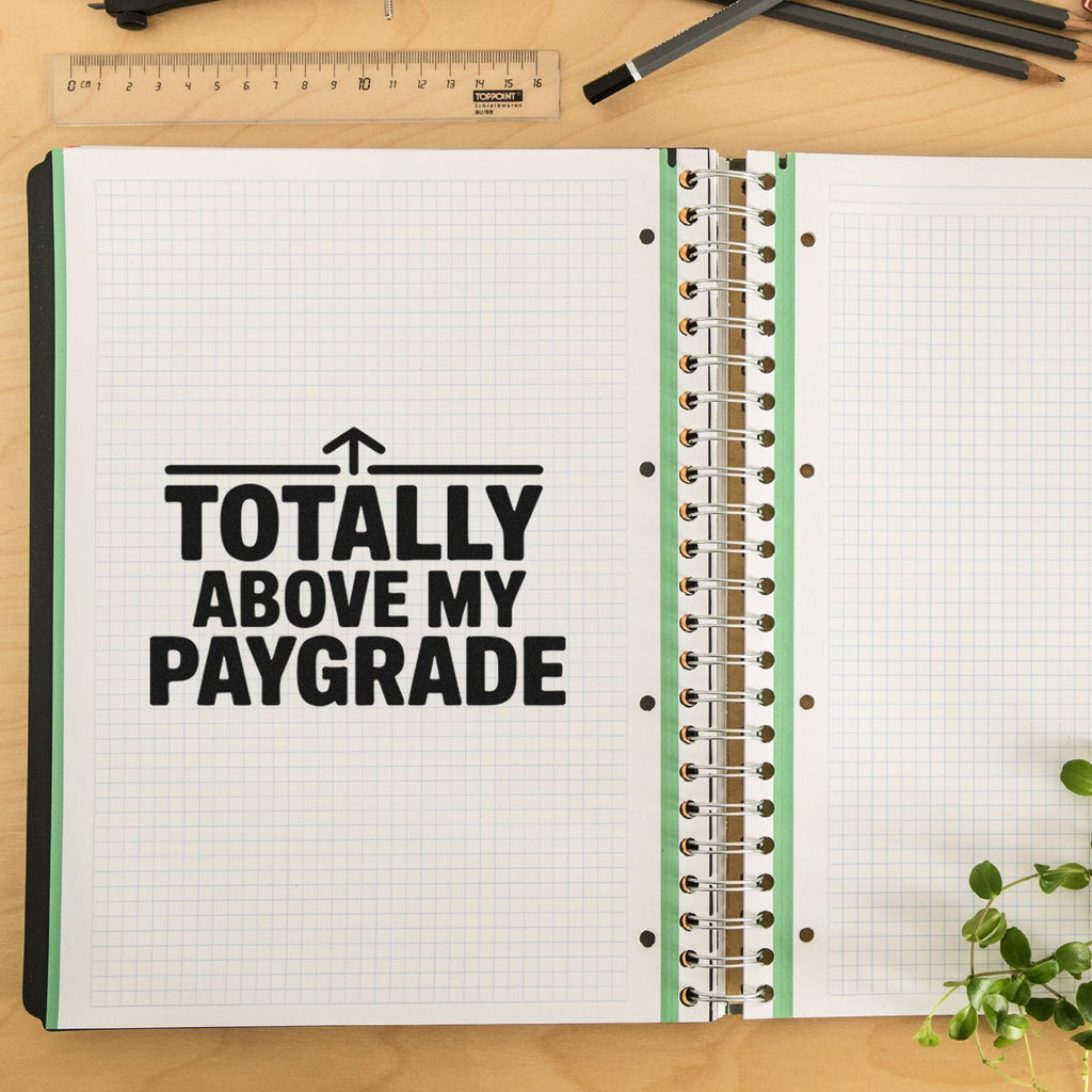 Own your paperwork with attitude: the Above Paygrade Sassy Office Slim Pre-Inked Stamp delivers a crisp, confident “Totally Above My Paygrade” message in bold black text on a clean white background, topped with an upward arrow that says it all—this one’s beyond your scope.