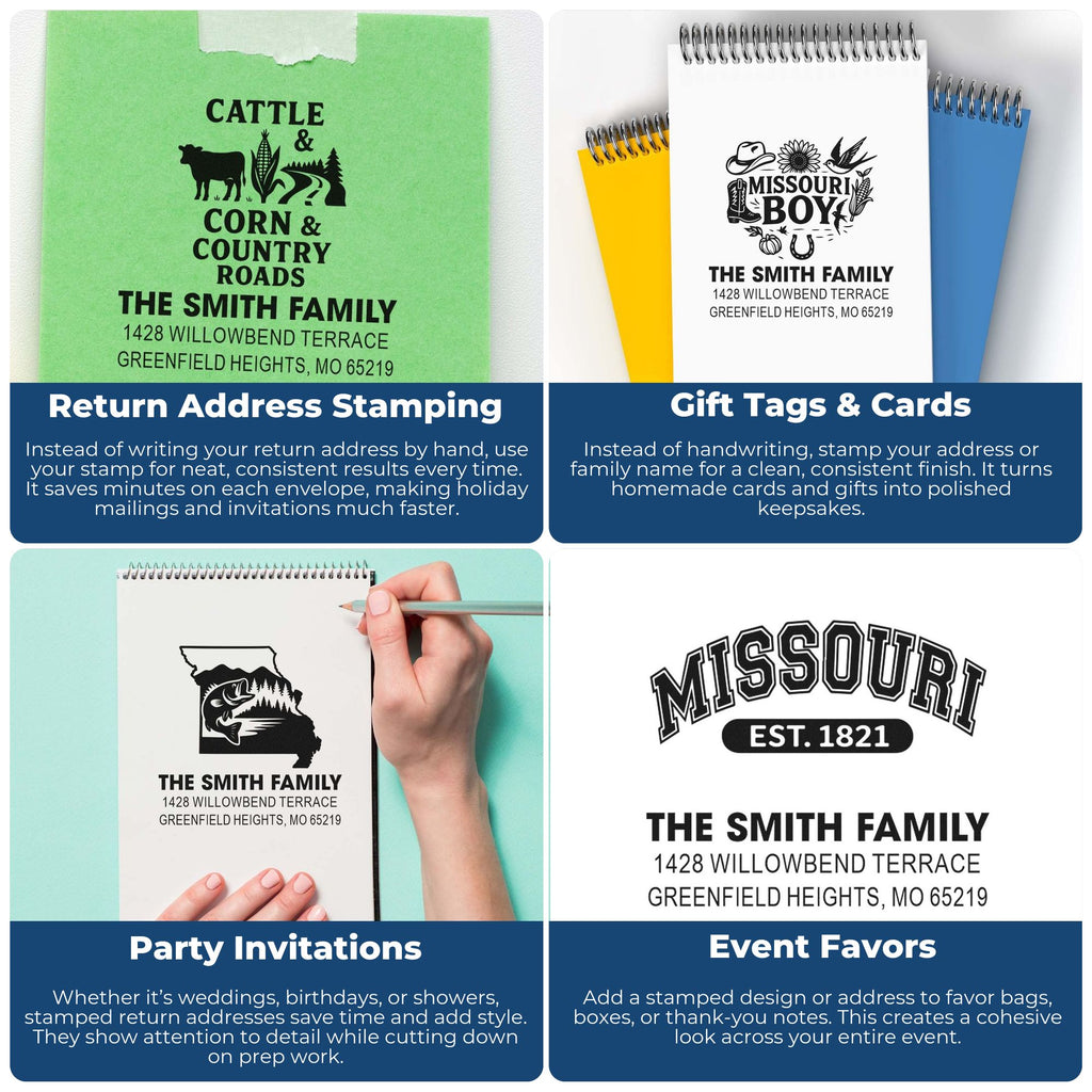 - Personalized Style: Create a clean, custom look with a three-line Missouri stamp that lets you add a name, address, or short message in a neat square format for mail, packaging, notes, and more.