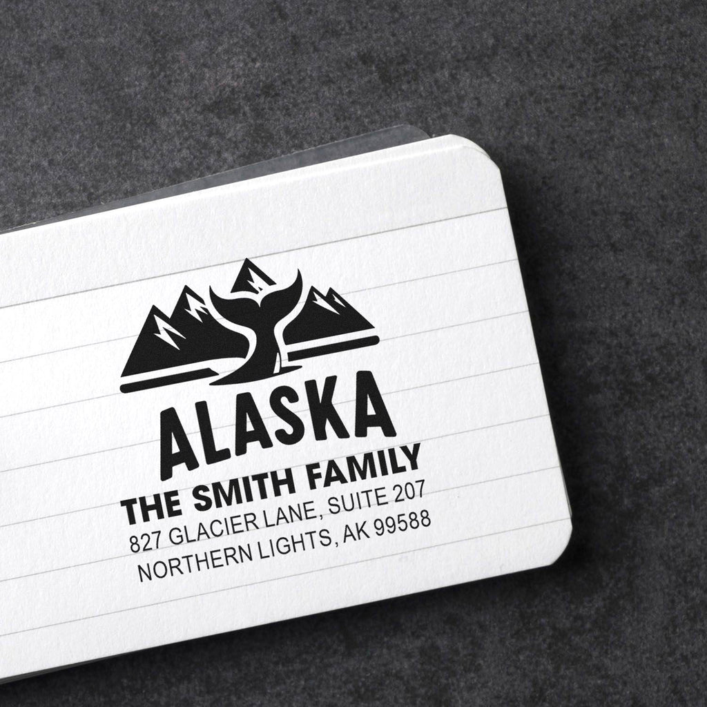 Capture the wild beauty of the Last Frontier with this Alaska Wilderness Design Self-Inking Stamp, sized perfectly at 1-5/8" for a bold yet refined impression. Featuring a striking mountain-and-whale-tail graphic with rugged Alaska-inspired detail, this self-inking stamp brings an adventurous, outdoor-ready look to every envelope, package, journal, or project.