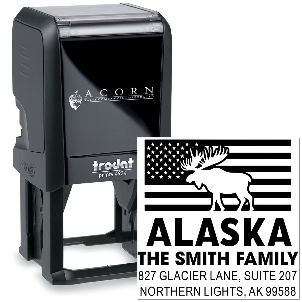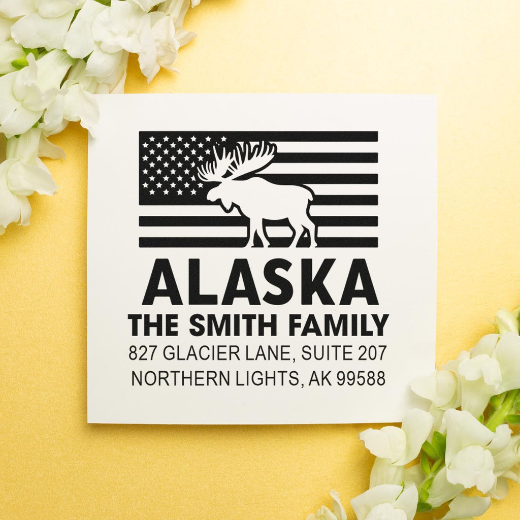 Bold Alaskan style meets everyday stamping convenience with our 1-5/8" Alaskan Moose Design Self-Inking Stamp. Featuring a striking moose silhouette inspired by the rugged wilderness of Alaska, this easy press-and-print stamp creates crisp, clean impressions with effortless use—perfect for personalizing documents, stationery, packaging, thank-you cards, envelopes, and more. Designed for smooth, mess-free stamping, it delivers a consistent, professional look every time while adding a memorable outdoors-inspired touch.