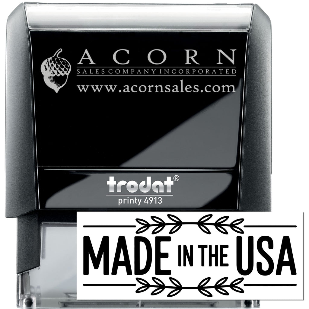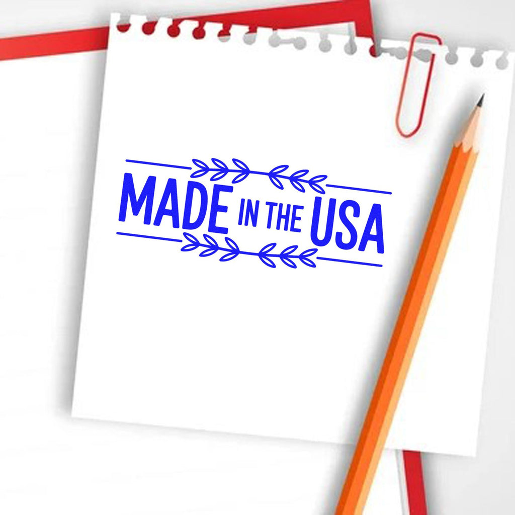 A polished “MADE IN THE USA” badge, framed with leafy branches and clean lines, instantly elevates cards, packaging, labels, and paper goods with one confident press. This American Craft Collection assembled self-inking stamp arrives ready to use—no separate ink pad, no fuss, just crisp, consistent impressions that look professionally finished every time.