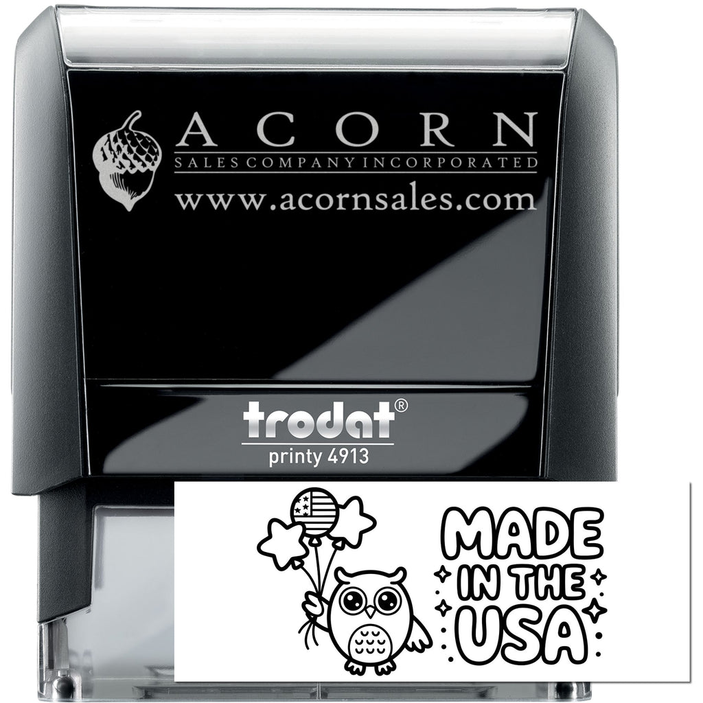 Featuring a black-and-white cartoon owl holding three balloons (one with a U.S. flag pattern, two star-shaped) plus big bubbly “MADE IN THE USA” lettering and sparkly accents, this stamp turns routine origin marking into a polished, on-brand finishing touch for packaging, tags, and paperwork.