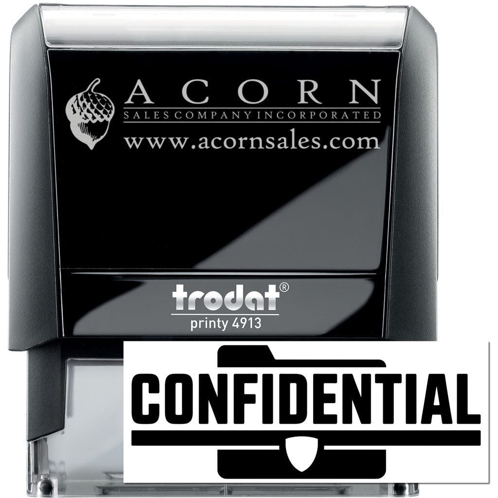 Bold by design: “CONFIDENTIAL” appears in strong black type on a crisp white field, backed by a folder icon and shield to signal secure handling, limited access, and controlled distribution—every single time you press down.