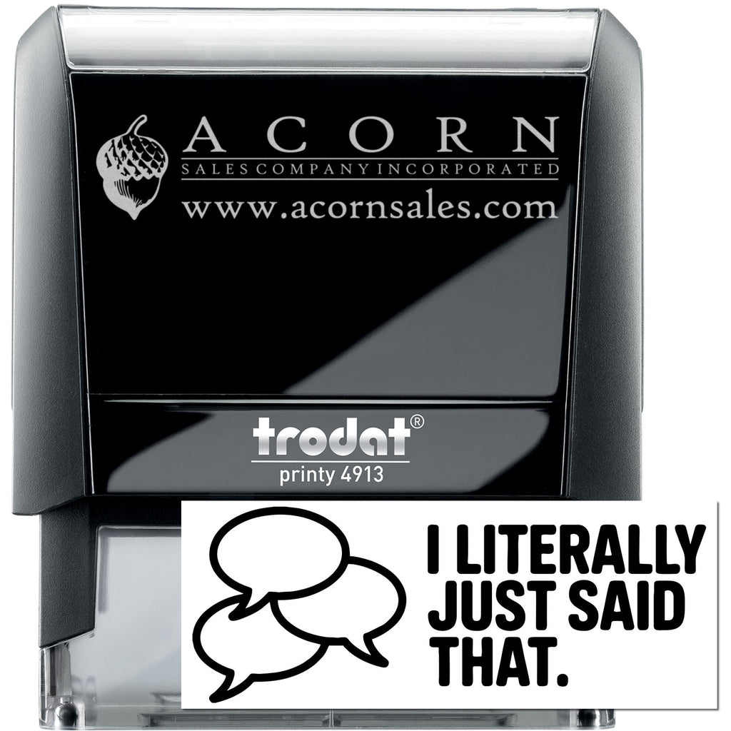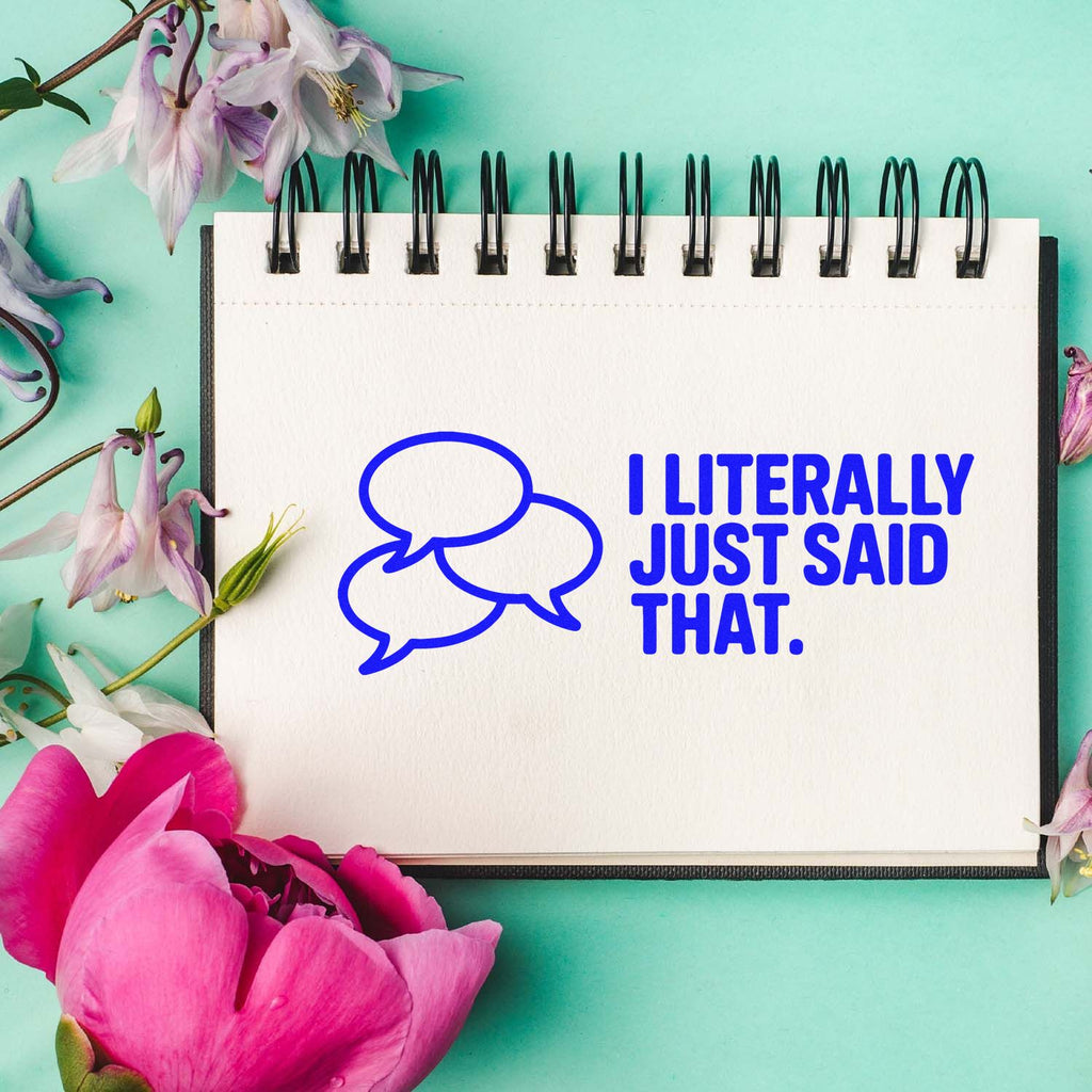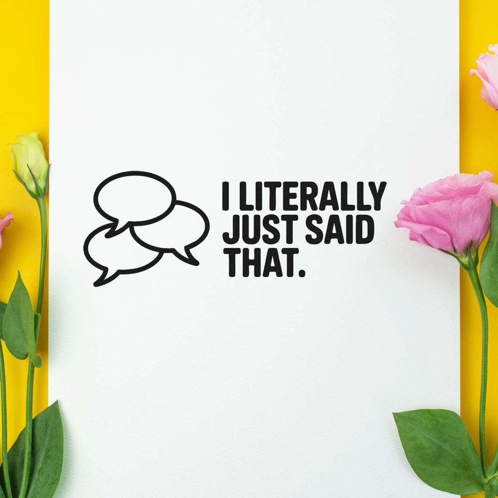 Radiate instant attitude with the Bubble Banter Shirt Novelty Self-Inking Stamp—featuring three overlapping speech bubbles on the left and bold, black I LITERALLY JUST SAID THAT on the right for a crisp, conversation-starting impression every time.