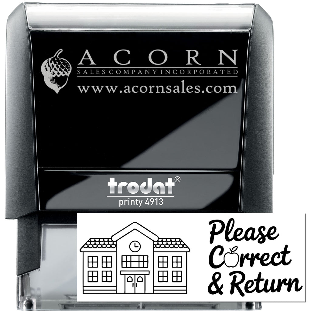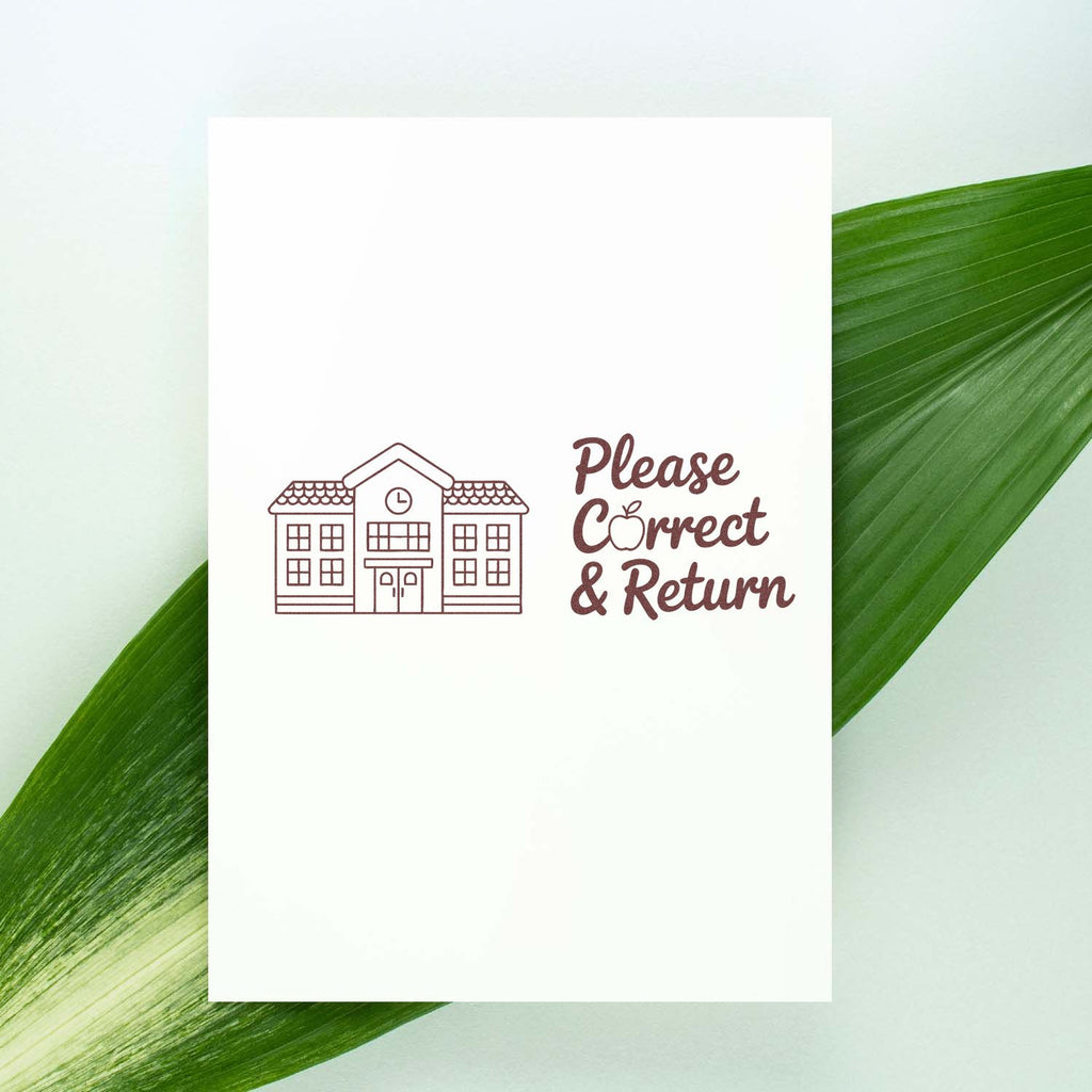 - Clarity: Crisp, laser-engraved die delivers a sharp black-and-white impression featuring a schoolhouse icon and decorative “Please Correct & Return” text with an apple detail—easy to spot, easy to understand, and always professional-looking.