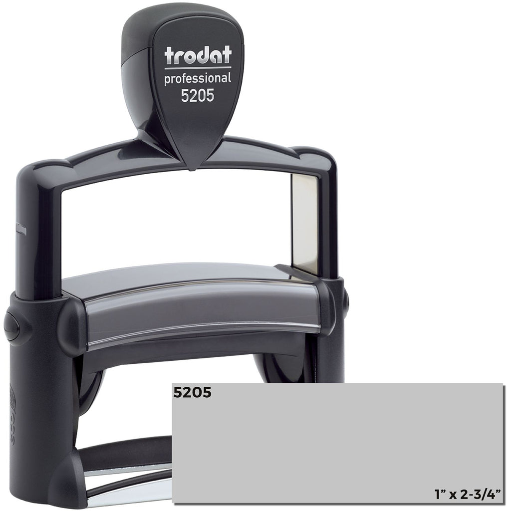 We also offer the ability to choose what color your impression will be with a variety of color options. This version can be used for a variety of tasks, such as; Advertising stamps, Logo stamps, Company or personal address stamps, and many more. This model also offers first-class user comfort with its newly designed ergonomic handle. With our high-quality, laser engraved rubber, and your ability to customize the stamp with your own design, the Trodat Professional 5205 is the perfect stamp for everyday business implications.