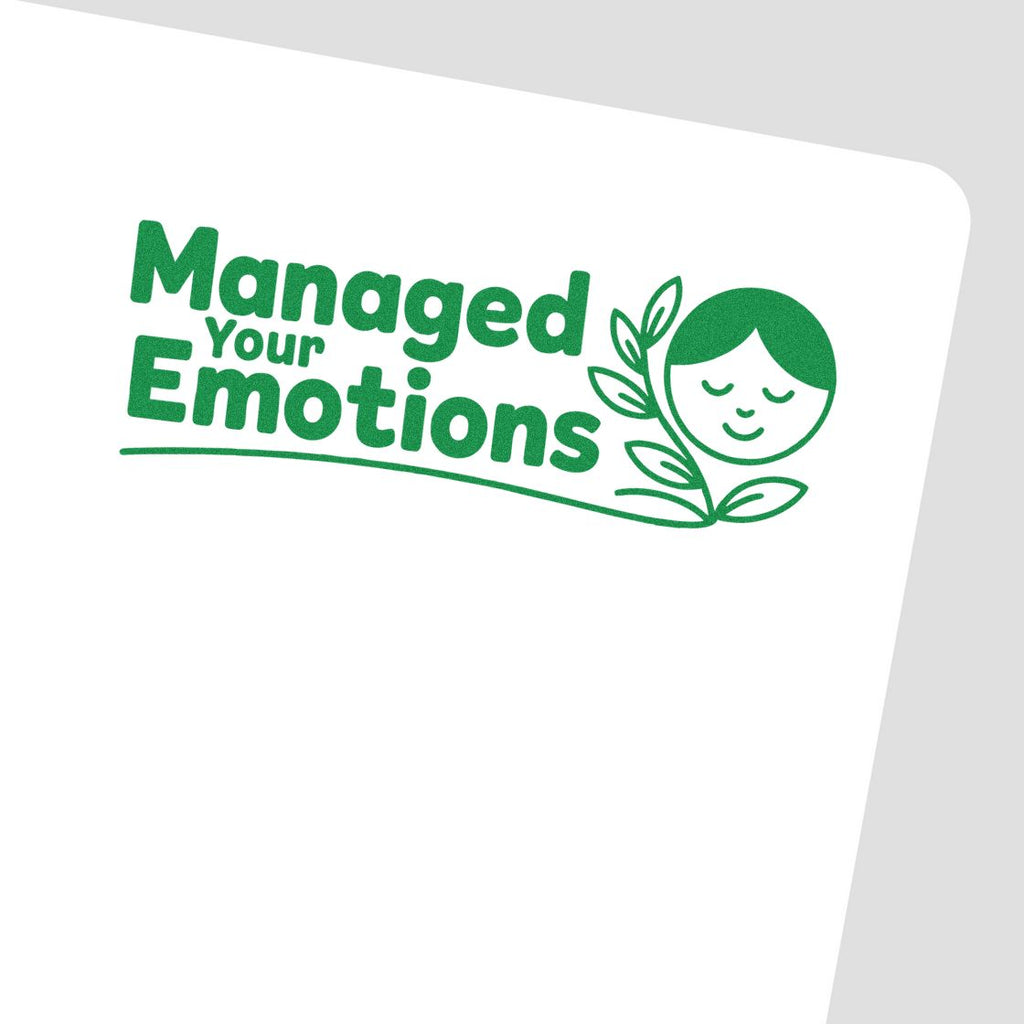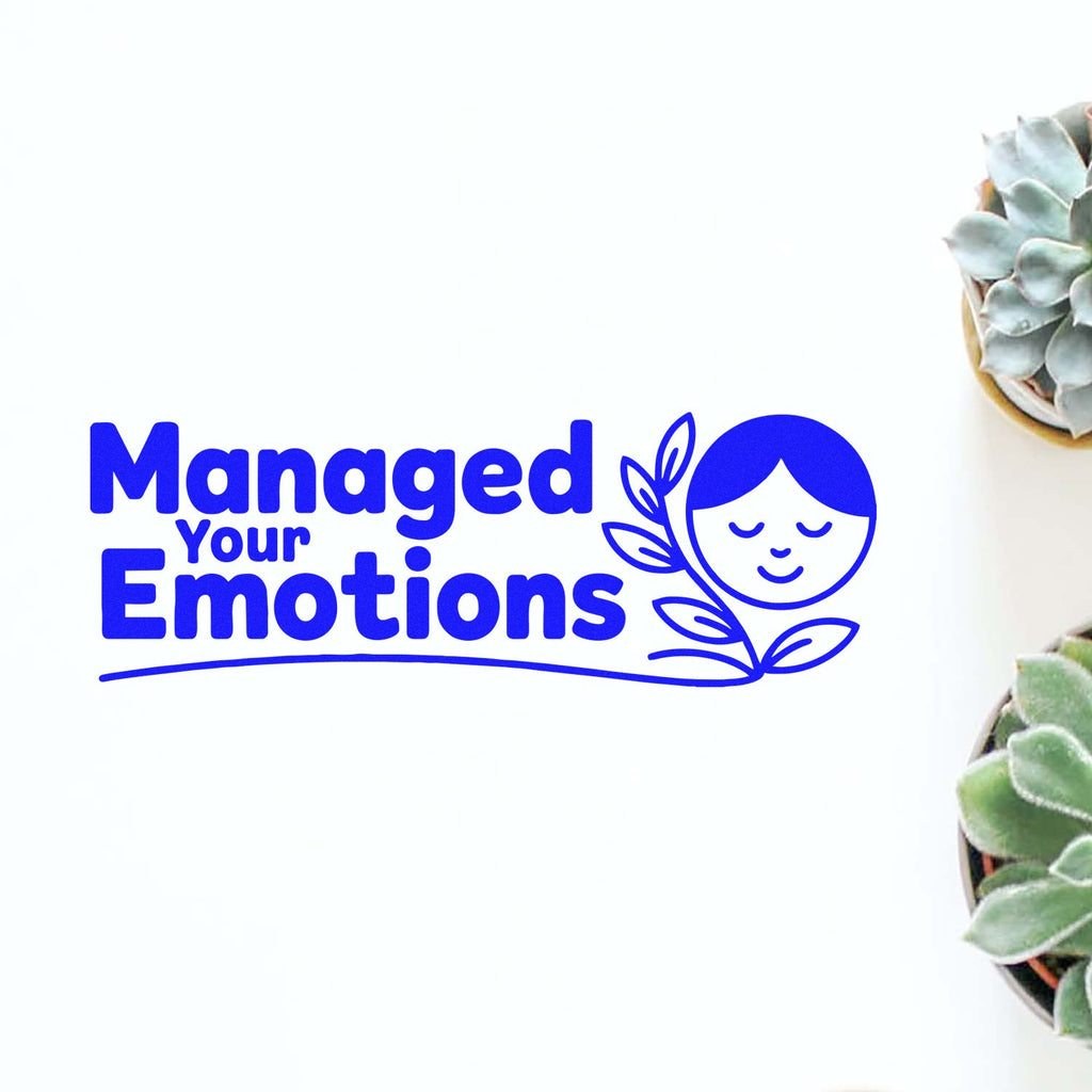 The design is calm and classroom-ready: a black-and-white banner with “Managed Your Emotions” in bold, rounded lettering, plus a serene closed-eye smile framed by leafy branches—gentle, encouraging, and never overwhelming.