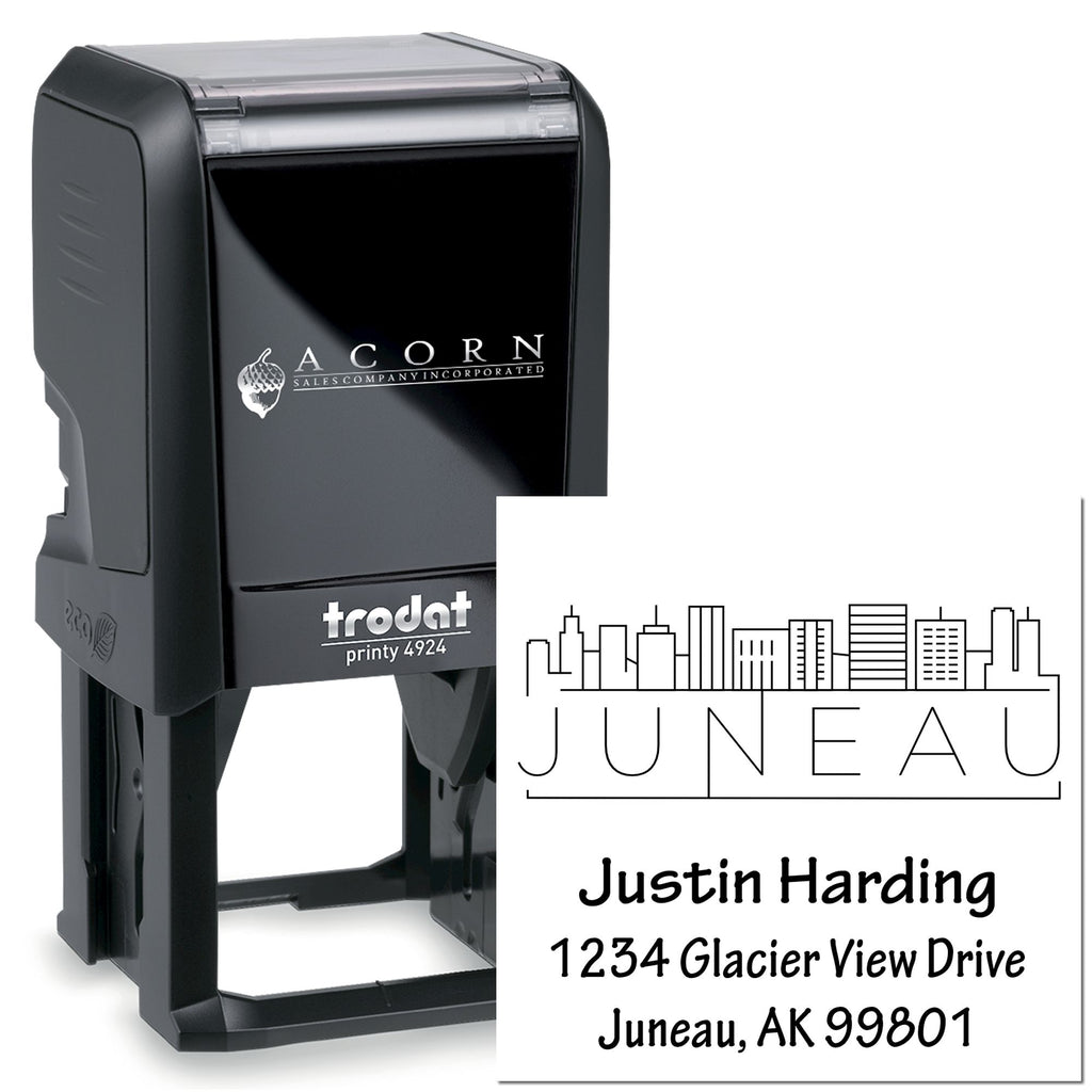 - Effortless Mailing: Speed up everyday correspondence with this Juneau architectural city skyline custom-made address stamp, designed to deliver a clean return address impression on envelopes, package labels, stationery, and thank-you cards.