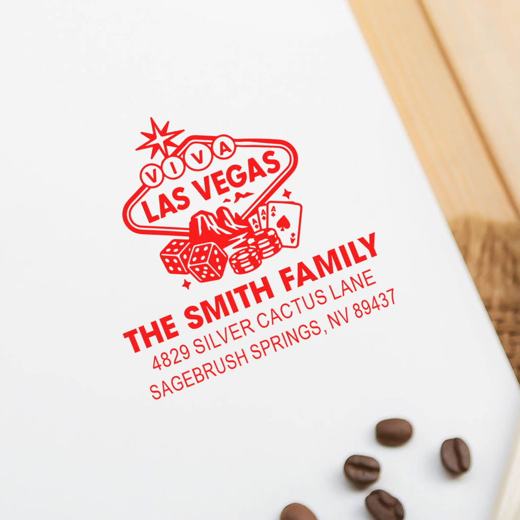 Capture the electric spirit of the Strip with the Viva Las Vegas Custom Square-Handle Rubber Pre-Inked Stamp—an irresistible little power piece for small business owners who want every impression to feel bold, polished, and unforgettable. Featuring the lively “Viva Las Vegas” graphic design with striking lettering, a dramatic mountain backdrop, and classic casino icons like dice and playing cards, this 1-5/8" square stamp brings nightlife energy and retro glamour to every mark.