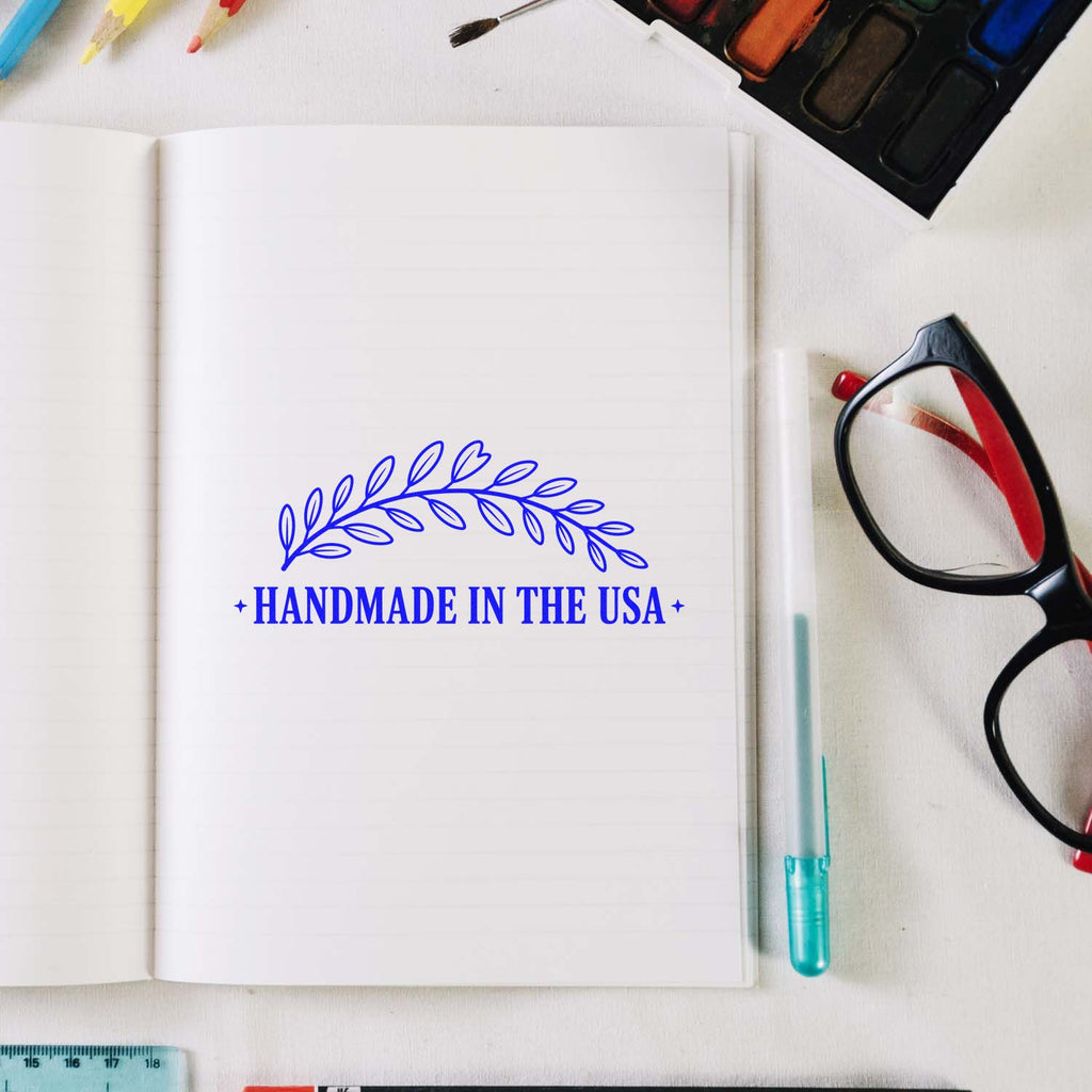 The design says it all: a simple black-and-white leafy branch arched above bold HANDMADE IN THE USA, finished with star accents for that authentic, stamped-by-hand look buyers love. Ideal for handmade sellers branding packaging and for DIY scrapbookers adding a signature mark to cards, journal pages, and happy mail.